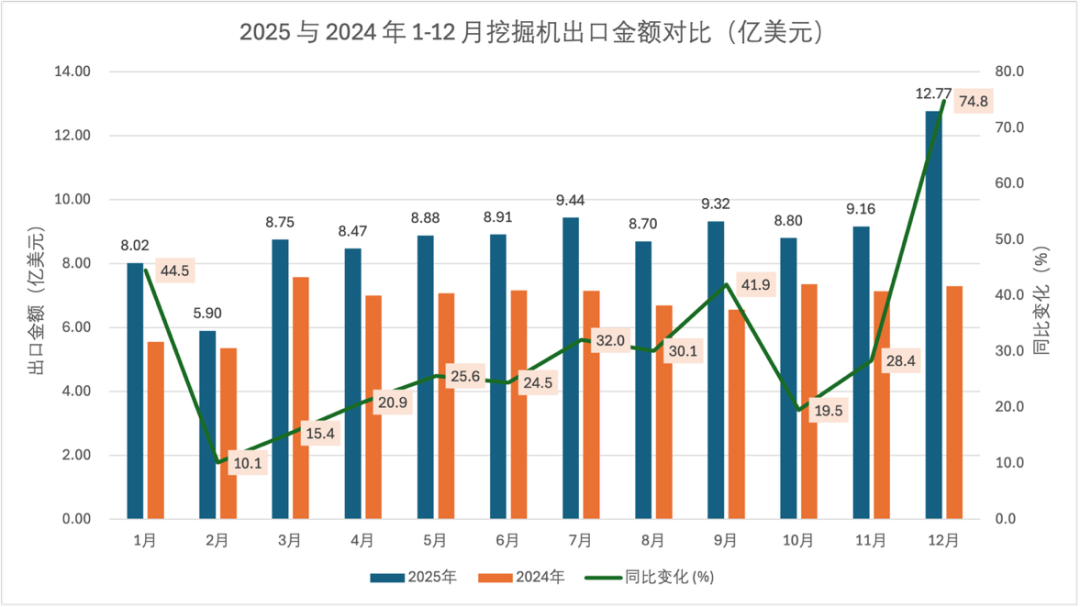 Peatolliameti statistika kohaselt ulatus Hiina ekskavaatorite eksport 2025. aasta jaanuarist detsembrini 10,711 miljardi dollarini (võrreldes 8,193 miljardi dollariga 2024. aastal), mis tähendab 30,8% kasvu võrreldes aastatagusega. Kumulatiivne ekspordimaht oli 316 700 ühikut (võrreldes 228 500 ühikuga 2024. aastal), kasvades 38,6%. Nii mahu kui ka väärtuse samaaegne tõus toob esile Hiina ekskavaatorinõudluse vastupidavuse maailmaturul.