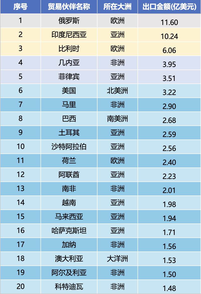 2025. aasta jaanuarist detsembrini eksporditavate koguste pingerea järgi on esikümnes kaubanduspartnerid USA (60359 ühikut), Indoneesia (21199 ühikut), Saksamaa (16034 ühikut), Belgia (15621 ühikut), Venemaa (11004 ühikut), Kanada (10442 ühikut), Filipiinid 9 ühikut, Itaalia (8 ühikut), Filipiinid 8 ühikut, Itaalia (1 ühikut 8 ühikut). ja Poola (7580 ühikut). Esikümne turu ekspordi kogumaht ulatus 168 000 ühikuni, mis moodustab 53,1% kogu ekspordikogusest, mis toob esile mastaabiefekti.