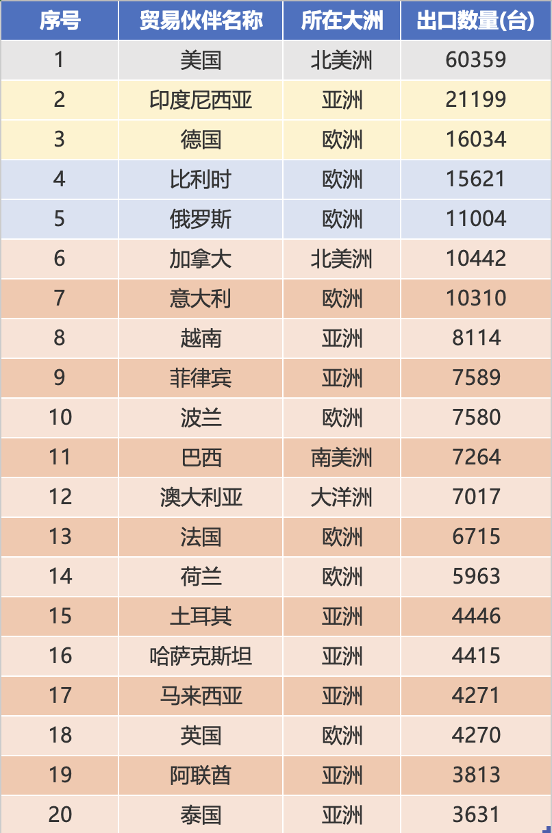 Erinevalt koguste edetabelist on USA ekspordimahuga üle 60 000 ühiku, mis on 2,8 korda suurem kui teisel kohal olevast Indoneesiast, ja ühikuhinnaga vaid 5000 dollarit ühiku kohta, mis tõstab esile tema majandusturu iseärasusi; Euroopa turu tulemused on muljetavaldavad, esikümnes on Saksamaa, Belgia, Venemaa, Itaalia ja Poola, mille ekspordi kogumaht on 61 000 ühikut, mis moodustab 36,0% kümne suurima turu kogumahust, peegeldades laiaulatuslikku nõudlust Hiina ekskavaatorite järele Euroopa turul; Aasias asuvad Indoneesia, Vietnam ja Filipiinid säilitavad stabiilse nõudluse, mille ekspordi kogumaht on 37 000 ühikut, mis on koguse poole oluliseks toeks.